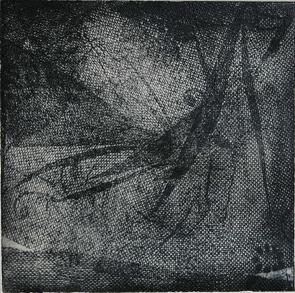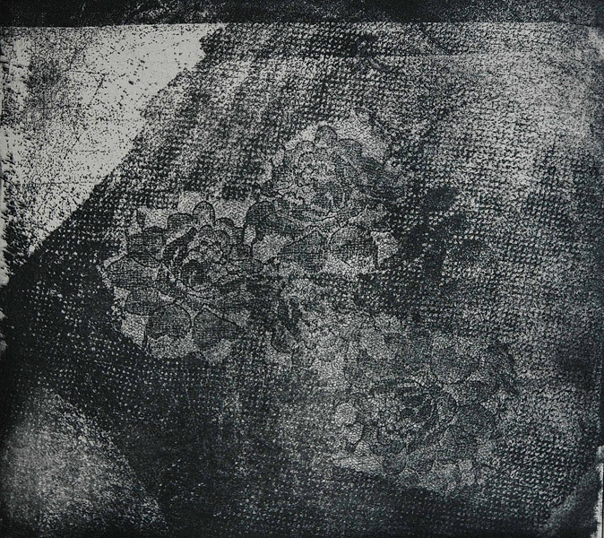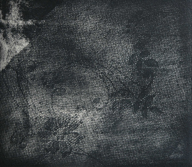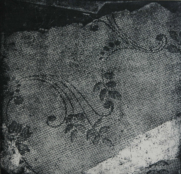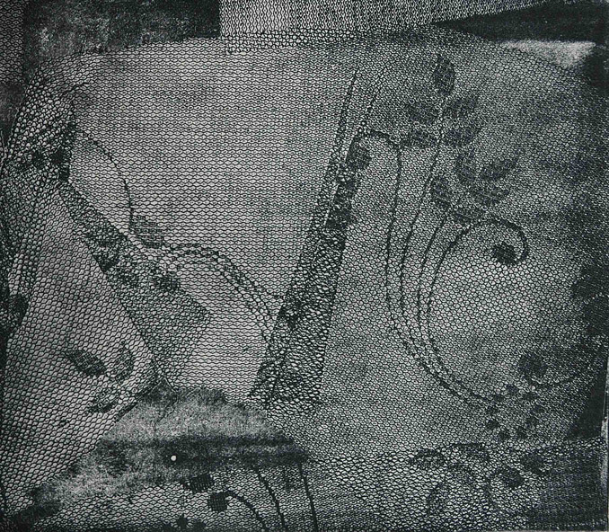 Feathers & Lace on copper. I use different grounds for etching, including soft and hard ground, for transferring flat objects and images onto metal. I also incorporate aquatint, sugar-lift, and line drawing techniques.